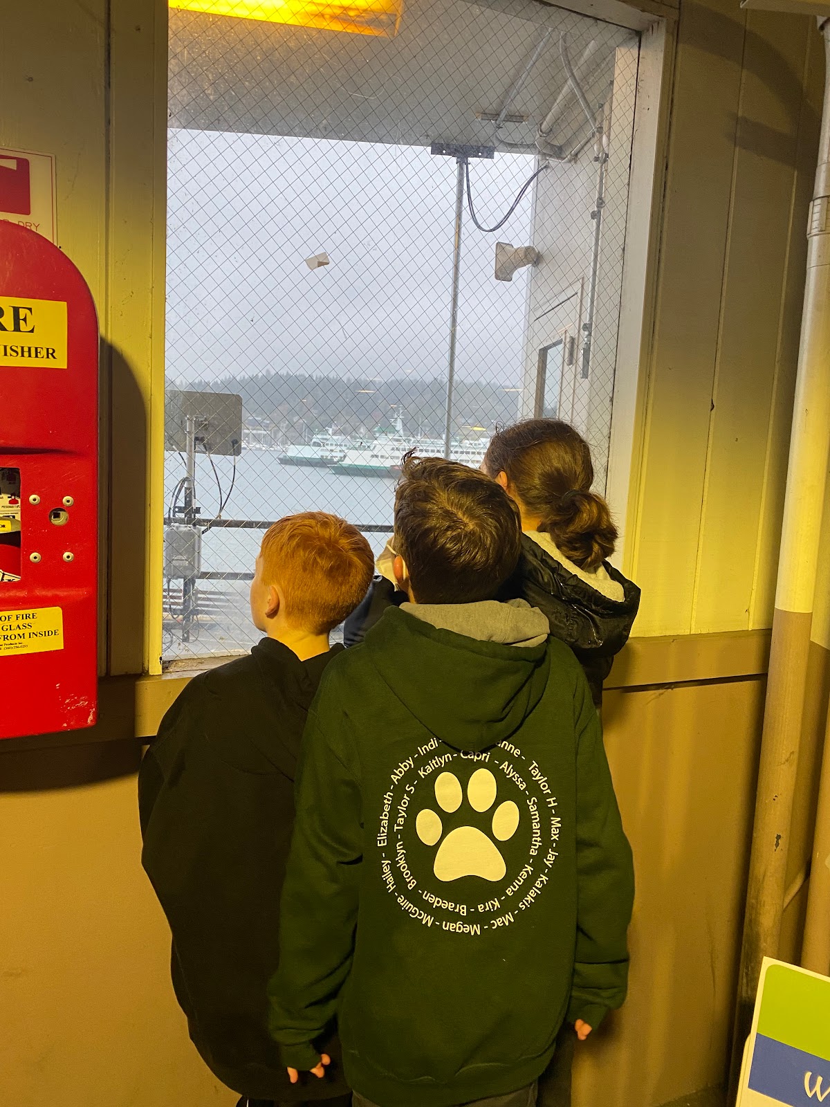 The Cuzins watching all the cars drive onto the ferry. We walked on while Randy and Toby drove with the cars. It never gets old seeing how many cars can fit on the boat. |